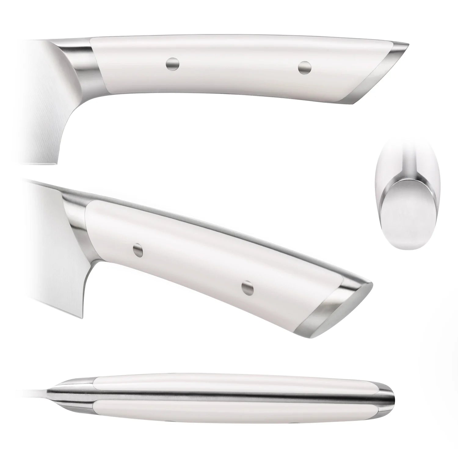 The HELENA Series is an elegantly minimalist interpretation of the modern kitchen knife. A slim, semi-bolster perfectly balances the knife's full tang while complementing the sleek, smooth lines of the handle. Two stain-resistant steel rivets solidly fasten the ergonomic handle to the blade, providing a secure, comfortable grip. Every blade is forged from high-alloy German X50CrMoV15 steel and meticulously heat-treated, ensuring a razor-sharp edge with exceptional durability and edge retention.
