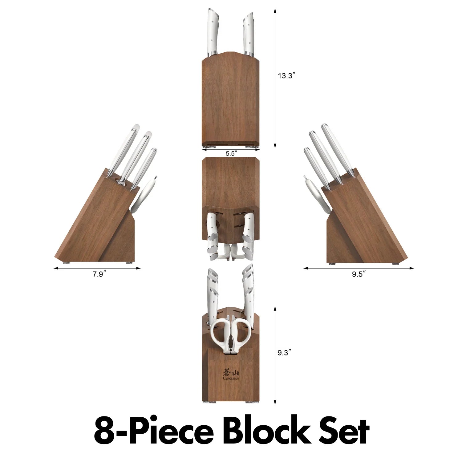 - Handcrafted, full-tang knives forged from tight-grained, German X50CrMoV15 steel for incredible durability, stain resistance, and edge retention. Blades are sharpened to a precise 16-degree angle.