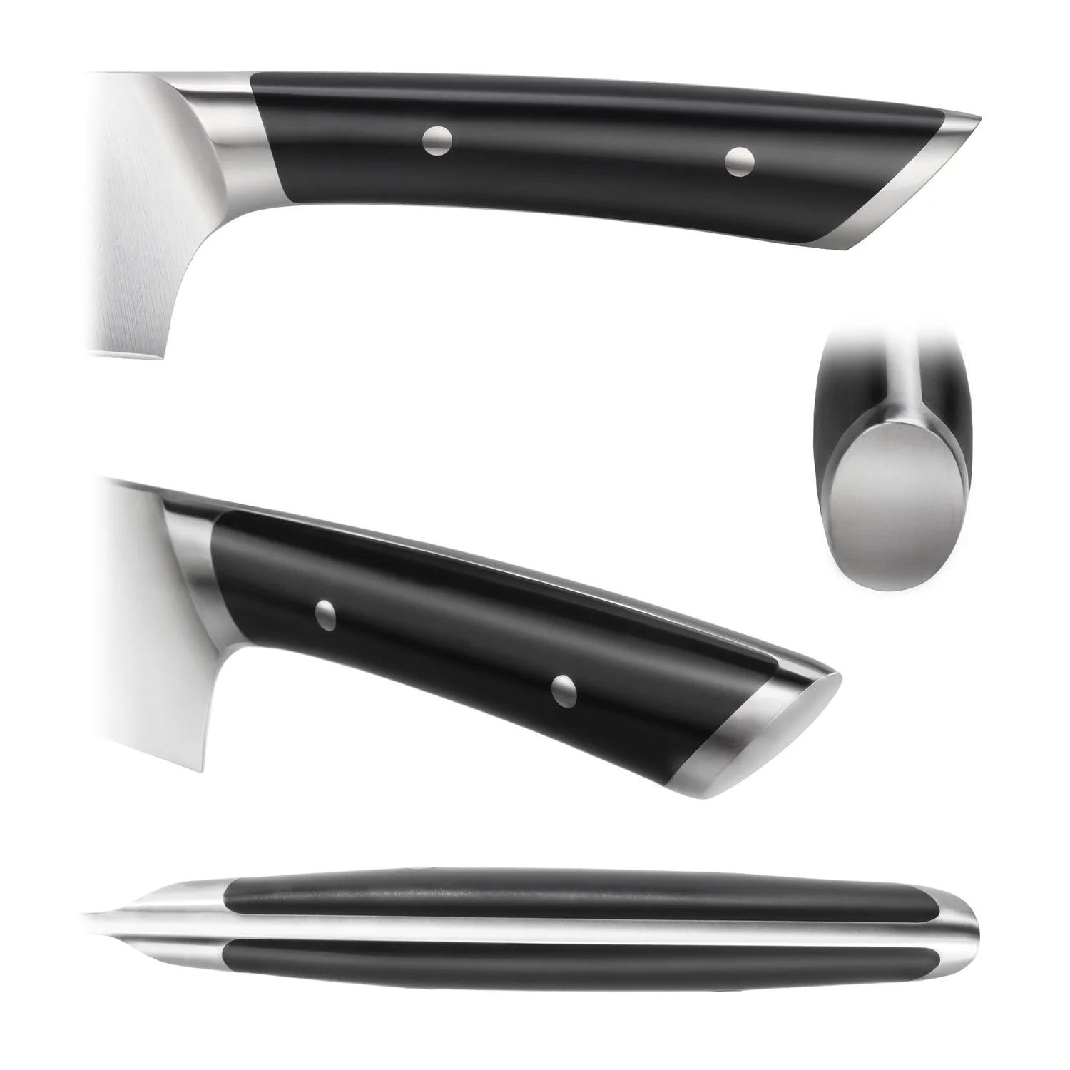 The HELENA Series is an elegantly minimalist interpretation of the modern kitchen knife. A slim, semi-bolster perfectly balances the knife's full tang while complementing the sleek, smooth lines of the handle. Two stain-resistant steel rivets solidly fasten the ergonomic handle to the blade, providing a secure, comfortable grip. Every blade is forged from high-alloy German X50CrMoV15 steel and meticulously heat-treated, ensuring a razor-sharp edge with exceptional durability and edge retention.