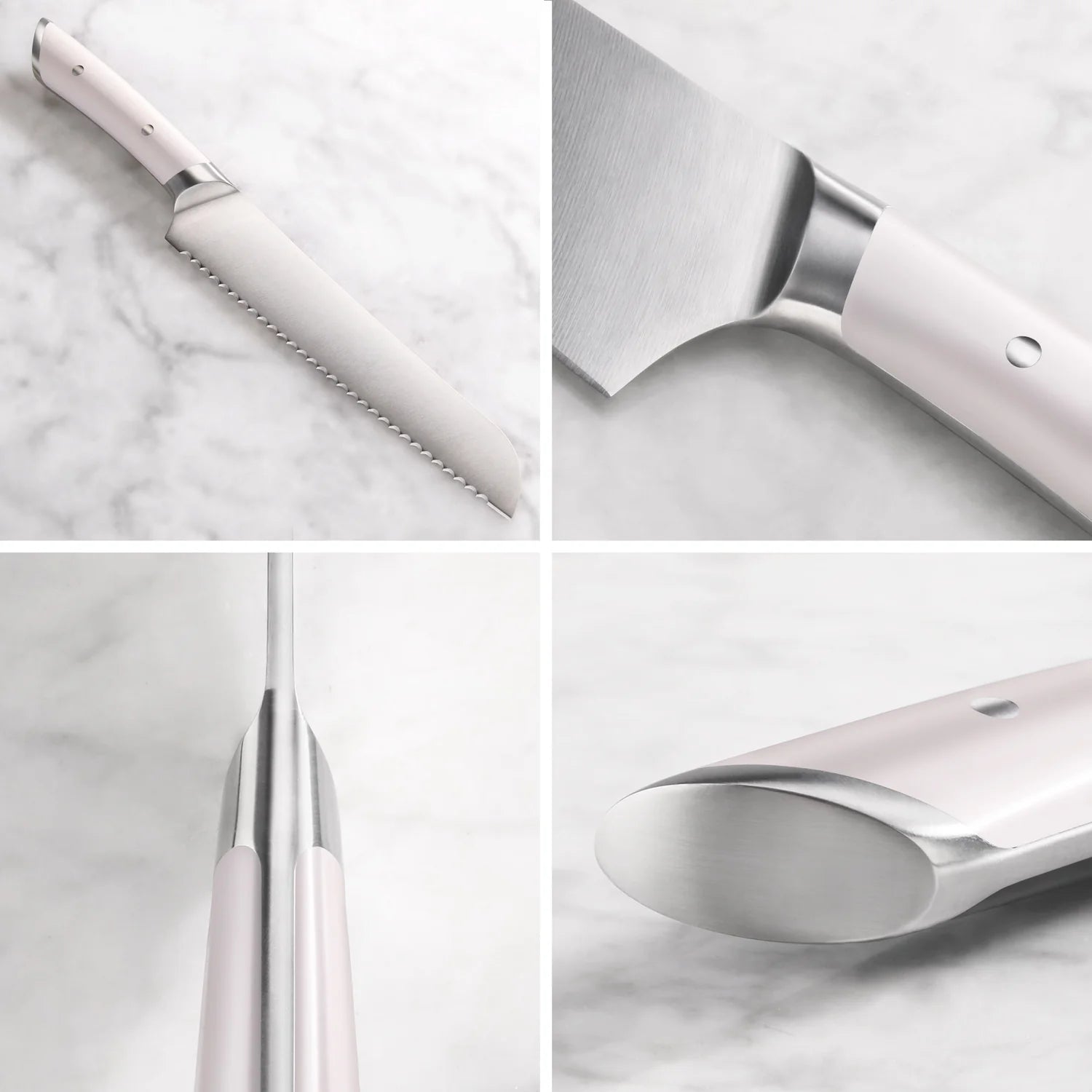 • The 8-inch Bread Knife features saw-like teeth that can slice bread from crust to crust without crushing the soft interior. In addition to breads, bagels, and pastry items, the serrations can pierce and slice through tough-skinned fruits and vegetables, with the 8-inch blade giving ample length to slice even large squashes and melons.