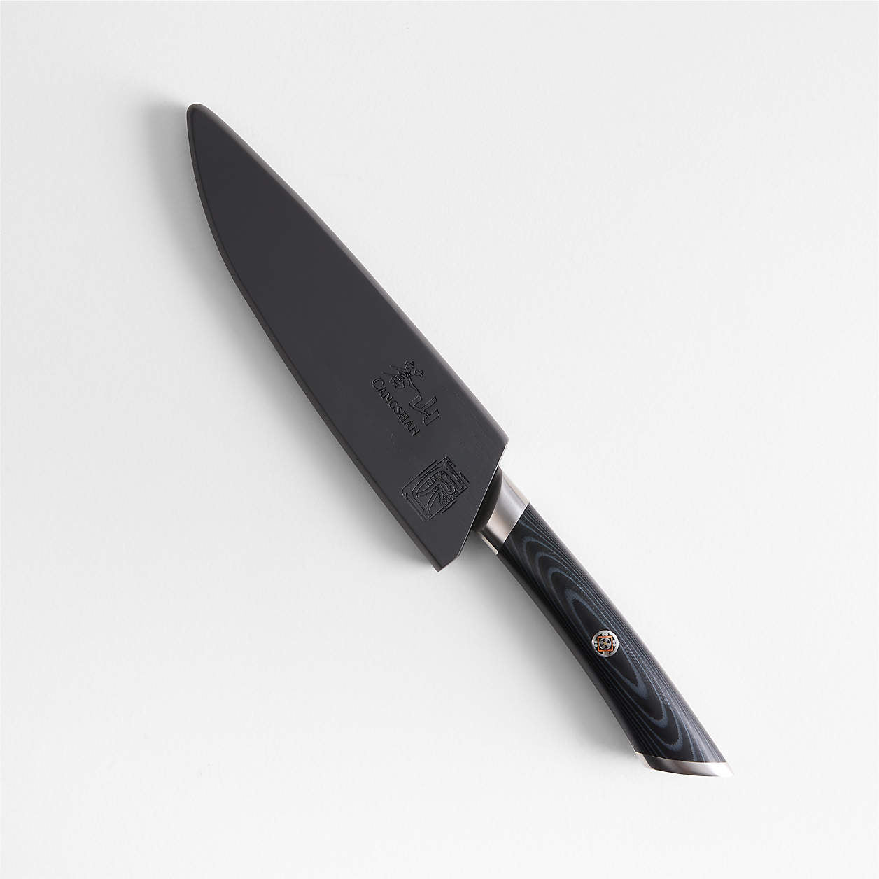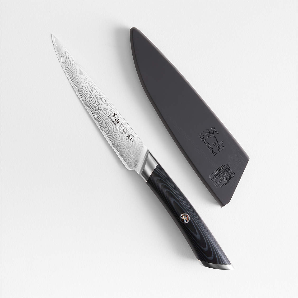 Stunning to look at and a revelation to use, this impeccably crafted utility knife eases a variety of cutting tasks. An impressive 67 layers of steel swirl the Damascus cladding, creating an enduring blade reinforced with a proprietary heat treatment. Skilled artisans sharpen the full-tang knife by hand to an extraordinary serrated edge, and the magnetic ashwood sheath protects the blade in a drawer or on camping trips and picnics. Crafted of durable fiberglass, the black and grey faux wood grain handle is secured with a single mosaic rivet for an ornate finishing touch.