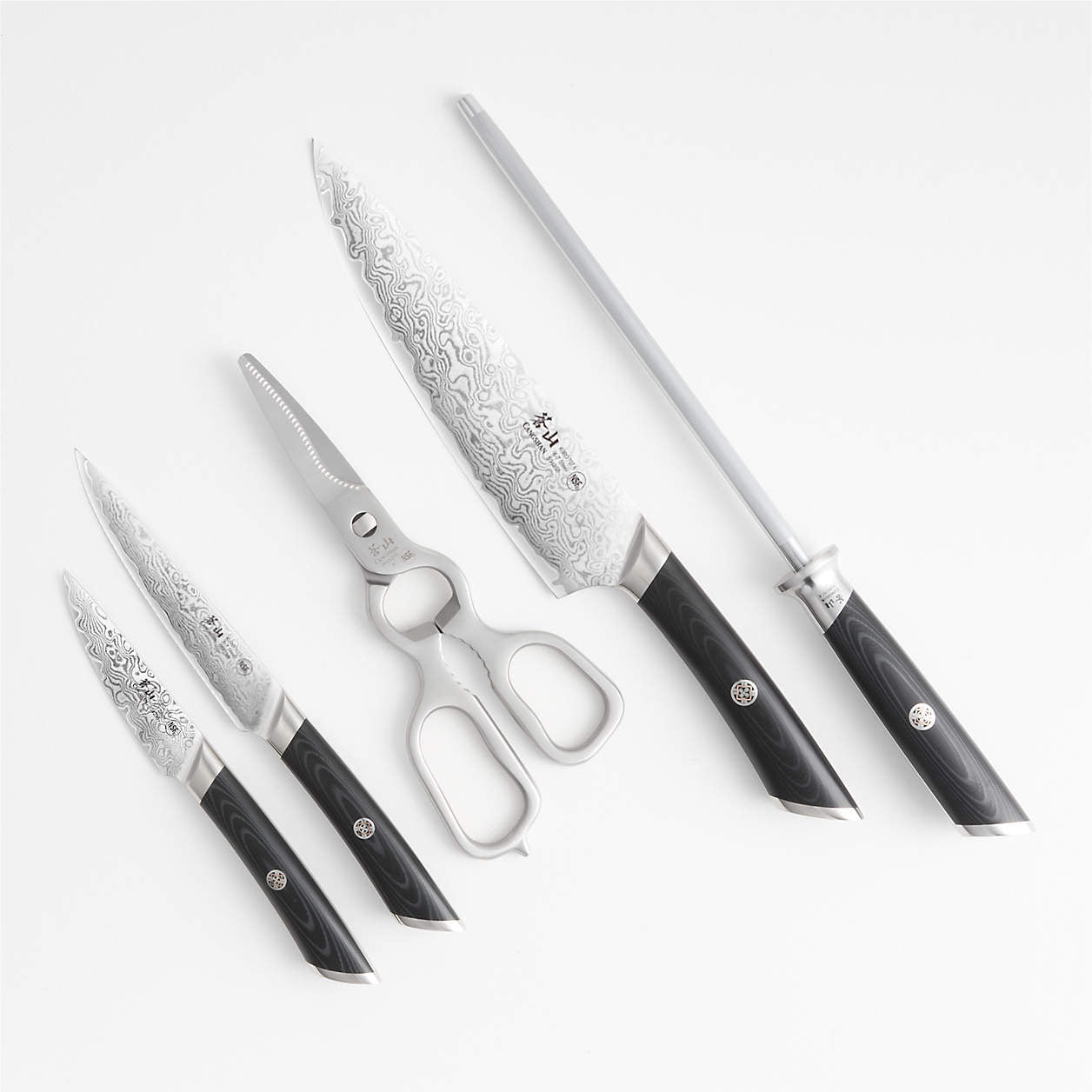 - Set: 3.5" paring, 5" serrated utility and 8" chef's knives, come-apart kitchen shears, 9" honing steel and 5-slot knife block