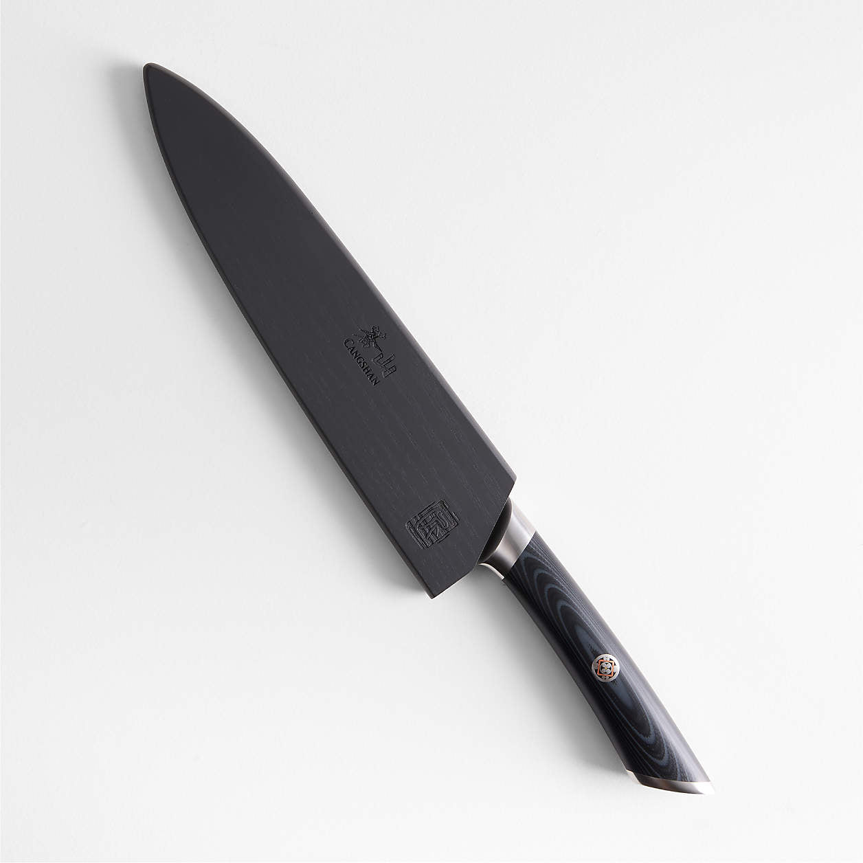 An impressive 67 layers of steel swirl the Damascus cladding, creating a long, slender and enduring blade reinforced with a proprietary heat treatment. Skilled artisans sharpen the full-tang knife by hand to an extraordinarily fine edge, and the magnetic ashwood sheath protects the blade in a drawer or on camping trips and picnics. Crafted of durable fiberglass, the black and grey faux wood grain handle is secured with a single mosaic rivet for an ornate finishing touch. Ideal for carving poultry and grand roasts, this carving knife makes a thoughtful gift for the holiday host.