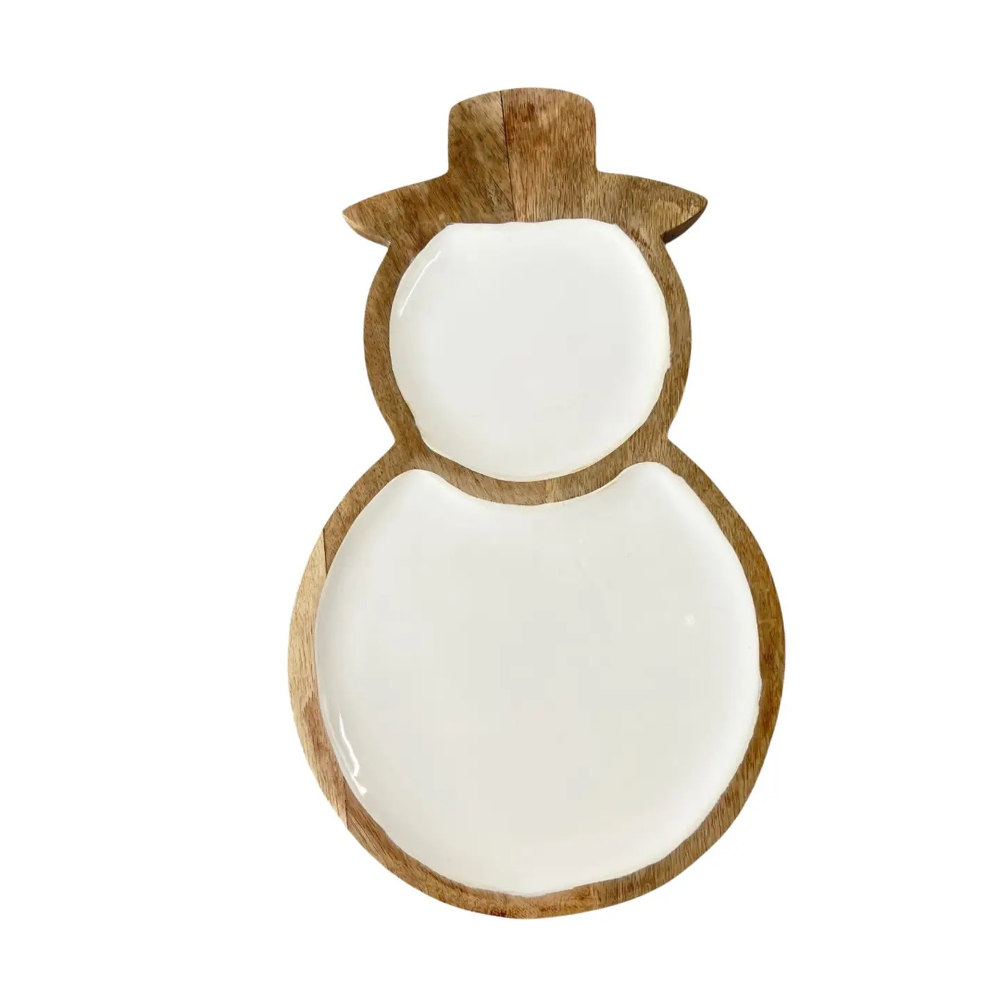 This elegant 15"x9" Snowman Tray, adorned with a charming hat, brings a refined touch to your serving needs. Its crisp white finish and sculpted design make it perfect for presenting appetizers or desserts with seasonal grace. A tasteful blend of whimsy and sophistication, it enhances any gathering with subtle festive charm. Made with mango wood.