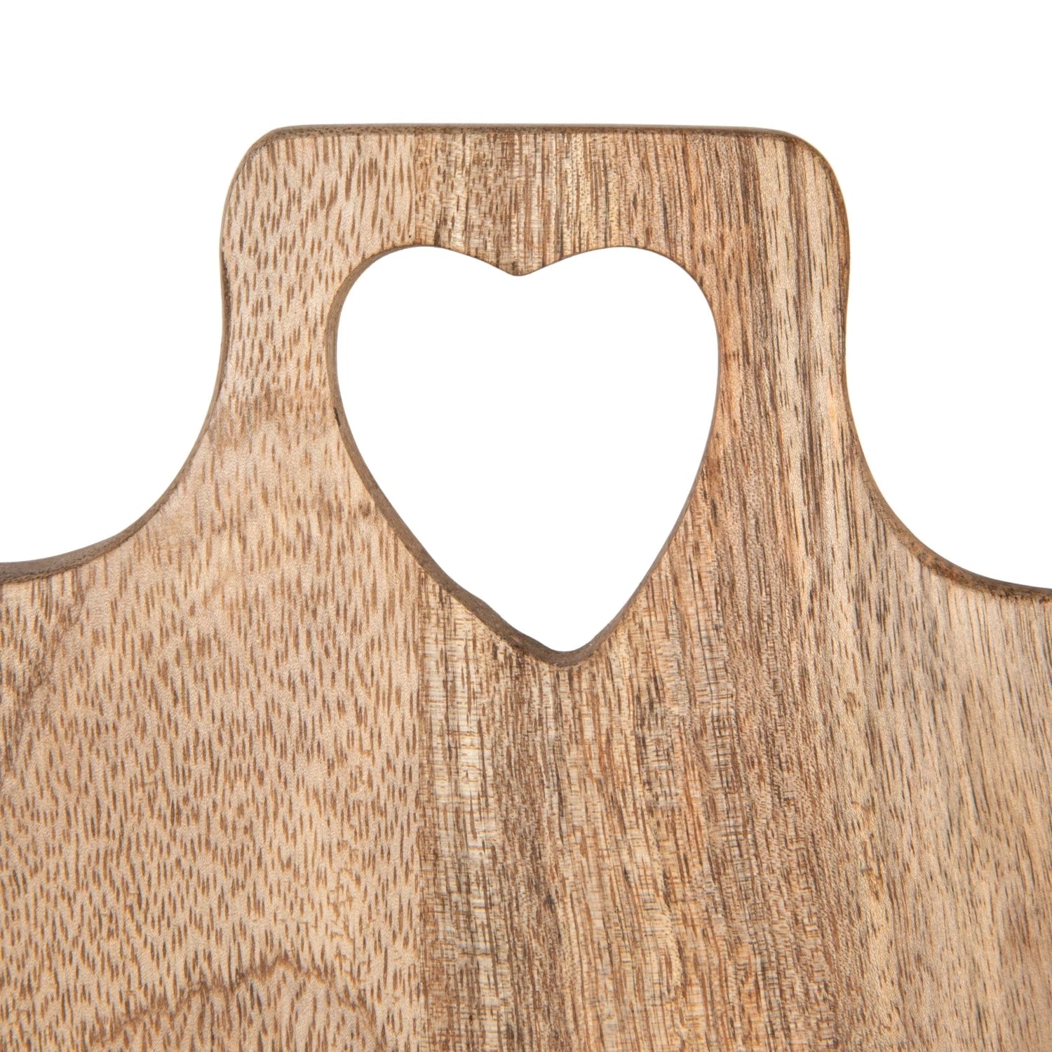 Bring a slice of charm to your kitchen with this Mango Wood serving and Cutting Board. Measuring 15 by 11 inches, it's the perfect stage for your snack masterpieces. Crafted from natural mango wood, it’s sturdy yet stylish, featuring a playful heart-shaped cut-out handle that adds a touch of love to every meal prep. Whether you're slicing cheese or chopping veggies, this board combines function and fun effortlessly.