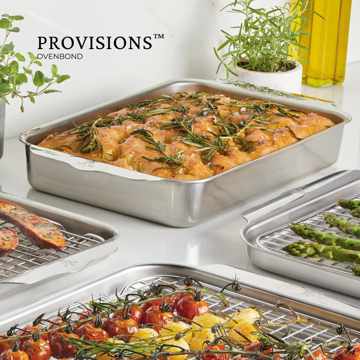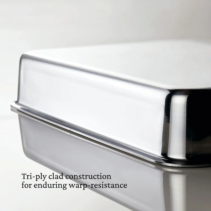 - WARP RESISTANT: Tri-ply clad stainless steel baking pan is thermal tested and engineered to be warp resistant, maintaining its shape for a lifetime of oven baking and roasting.