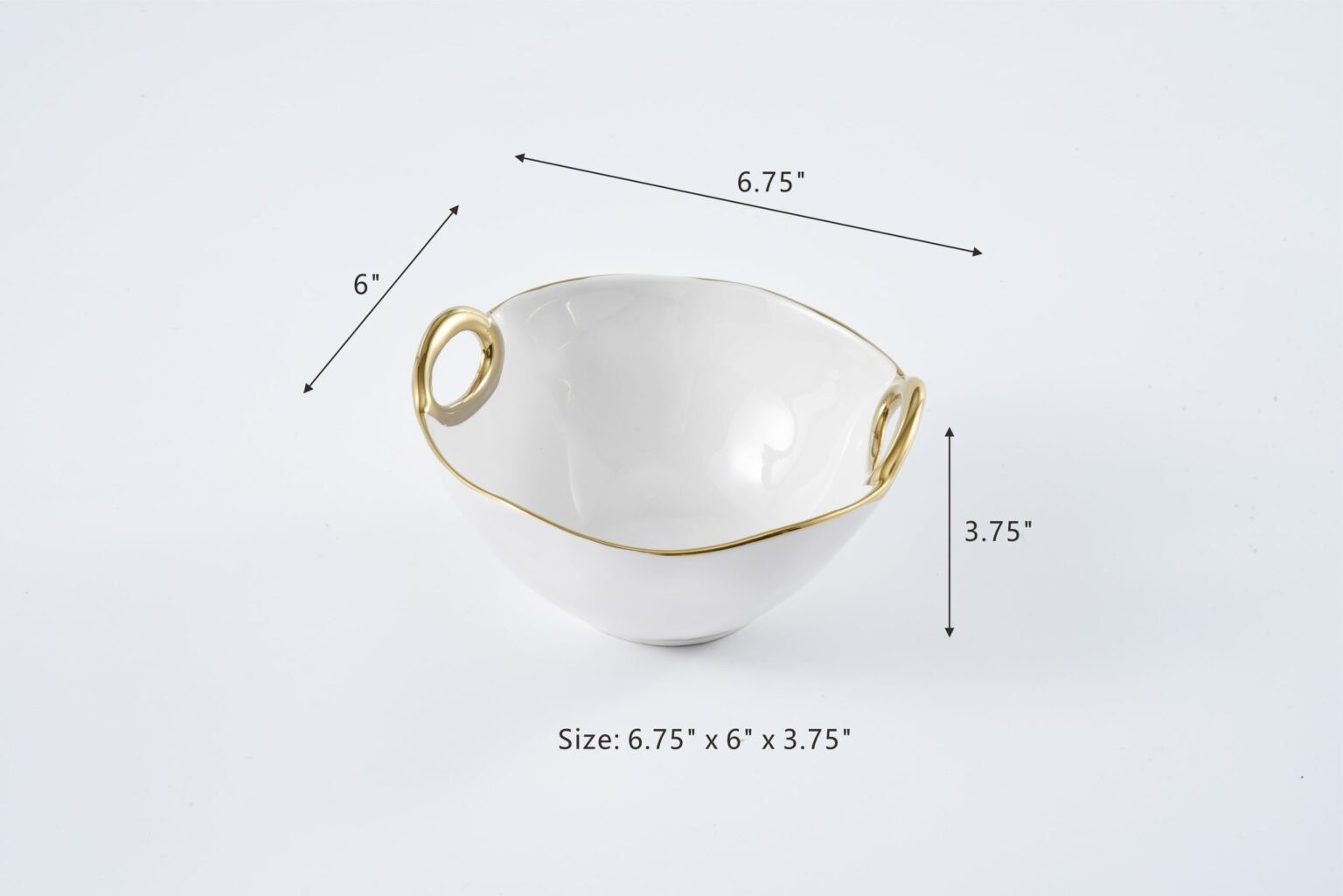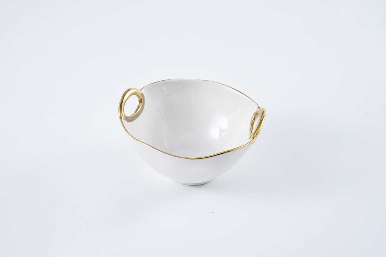 Medium Bowl in Golden Handles. Whatever you are serving, from salads to sides, they will look even more appetizing in this beautiful bowl. Stunning white porcelain with smooth and fluent handles in gold titanium. Food safe, dishwasher safe, oven safe to 500°. Easy Care.