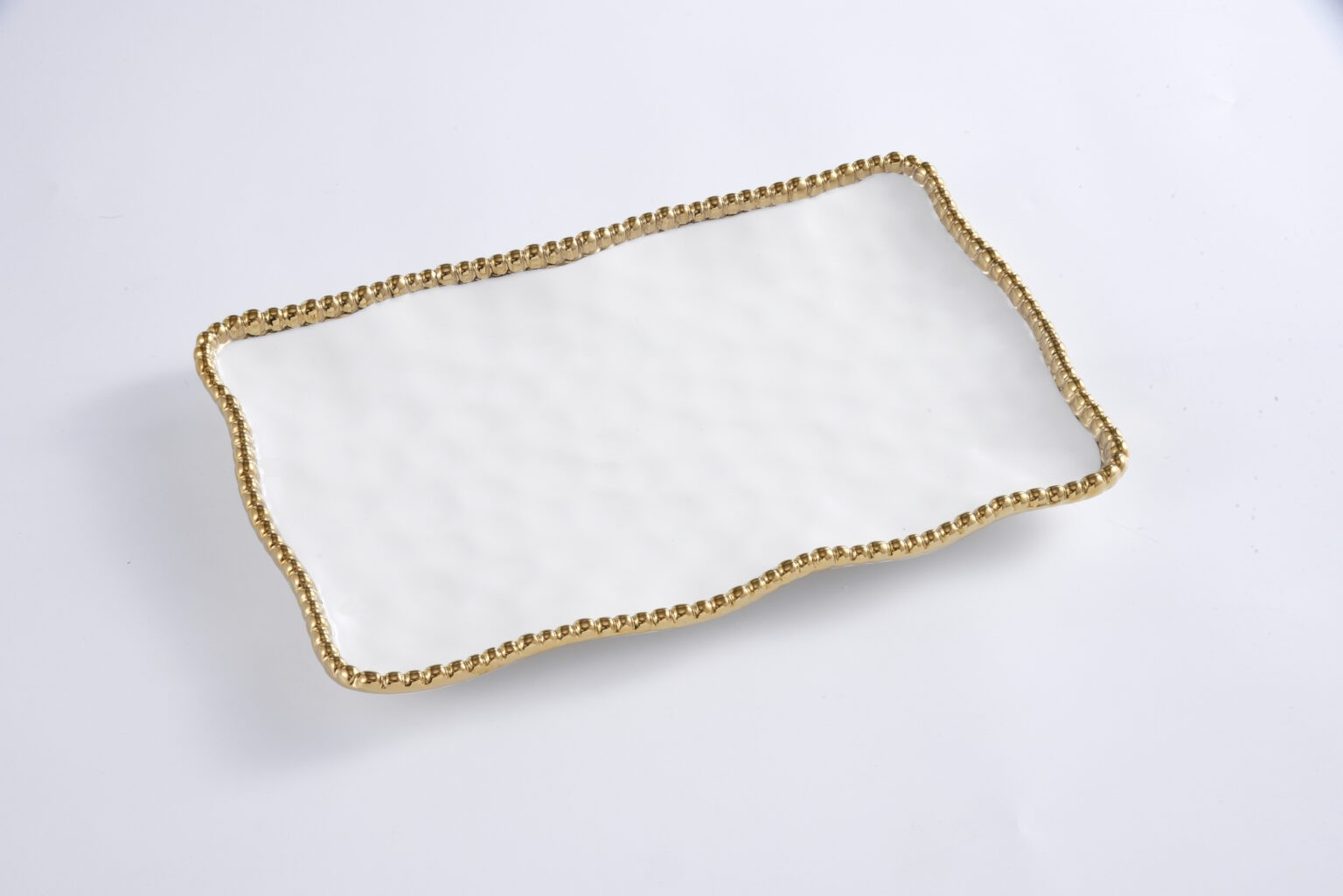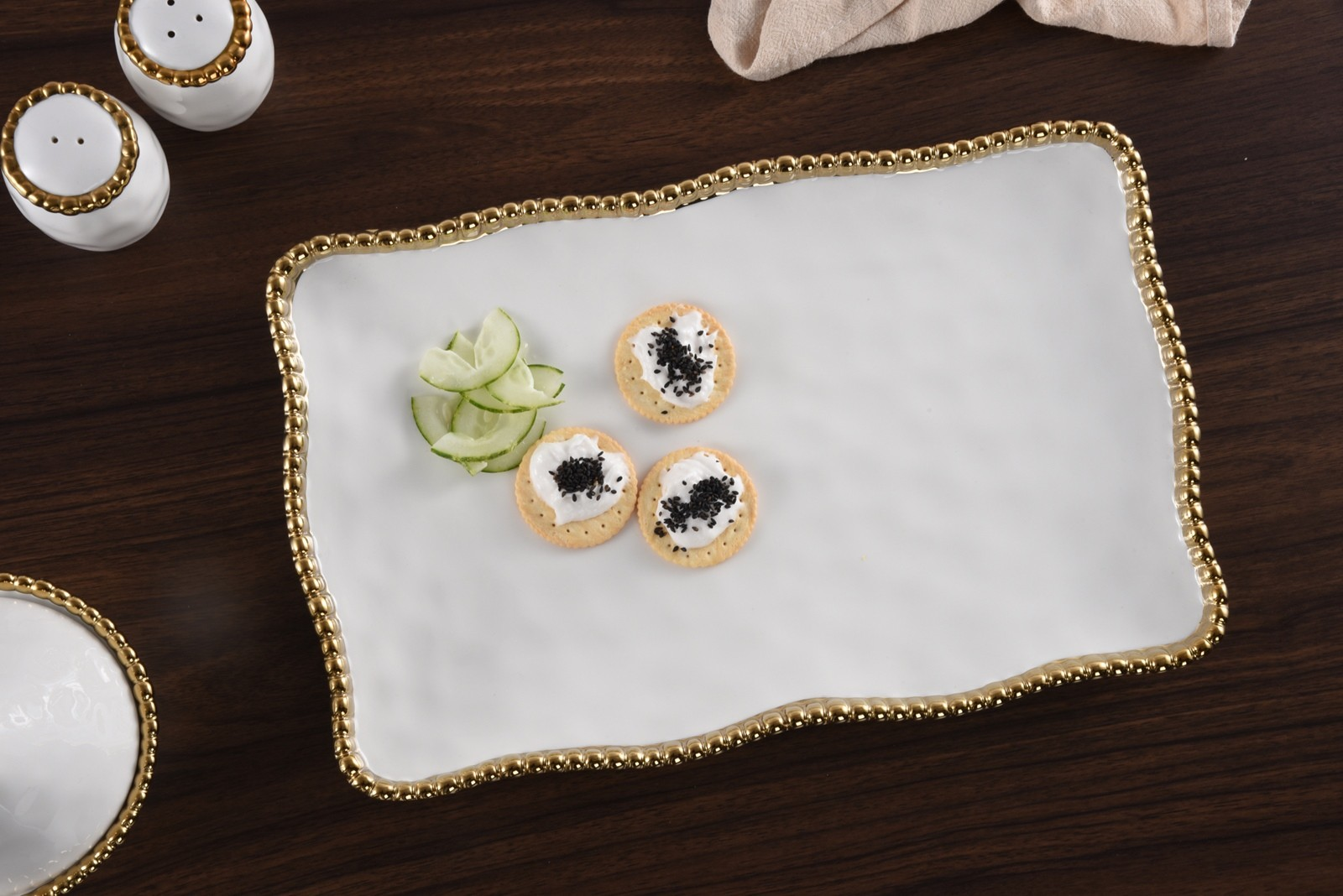 Medium Platter in Golden Salerno. Great for serving a freshly sliced baguette, stuffed mushrooms, or fruit. Asparagus, carrots, green beans, even a whole fish all are stunning on this piece. Crafted in a stunning titanium finish with lustrous gold beads. Food safe. Food safe. Dishwasher safe. Oven safe to 500°. Tarnish and stain-free. Easy Care.