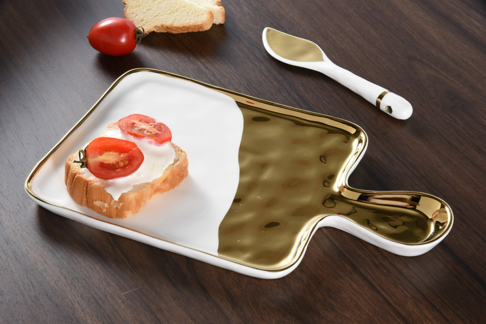 Ideal for all gifting occasions or to gift to yourself! Beautifully packaged in a magnetic closure gift box with a fun sentiment on the inside cover that can be personalized. Great for serving sliders, small sandwiches or other hors d” oeuvres! Both tray and spreader made of gorgeous white porcelain with gold titanium accents and trim. Food safe, tarnish free, dishwasher safe, oven safe to 500°. Easy Care.