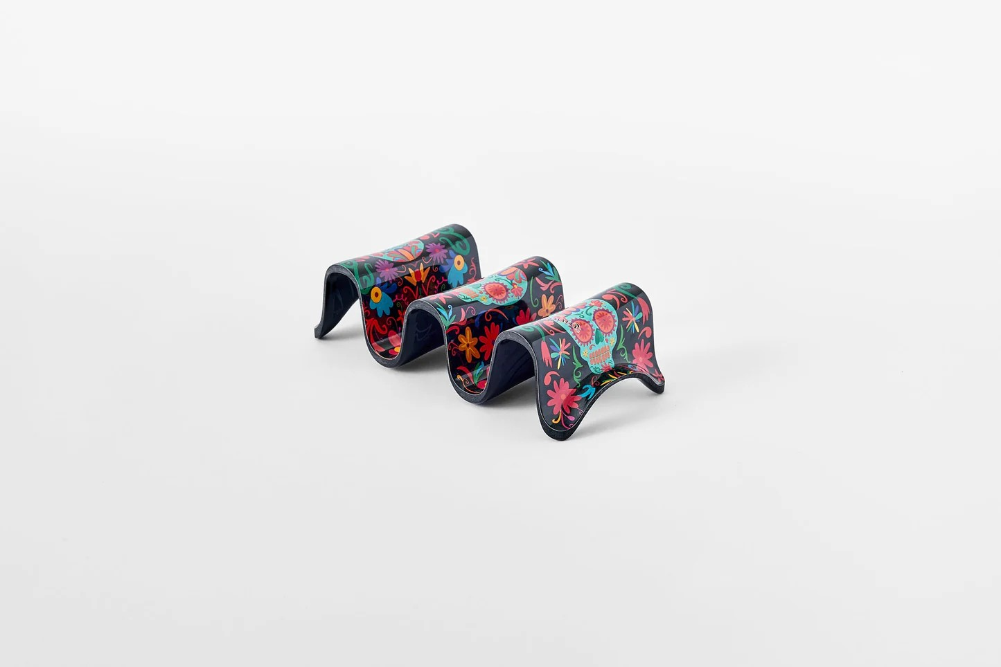 Reversible shape supports 2 or 3 tacos for easy filling and eating. Decorative holder has the look of traditional ceramic with a durable melamine construction. Works with both soft or hard taco shells. Available in blue, red and yellow with unique graphic patterns.