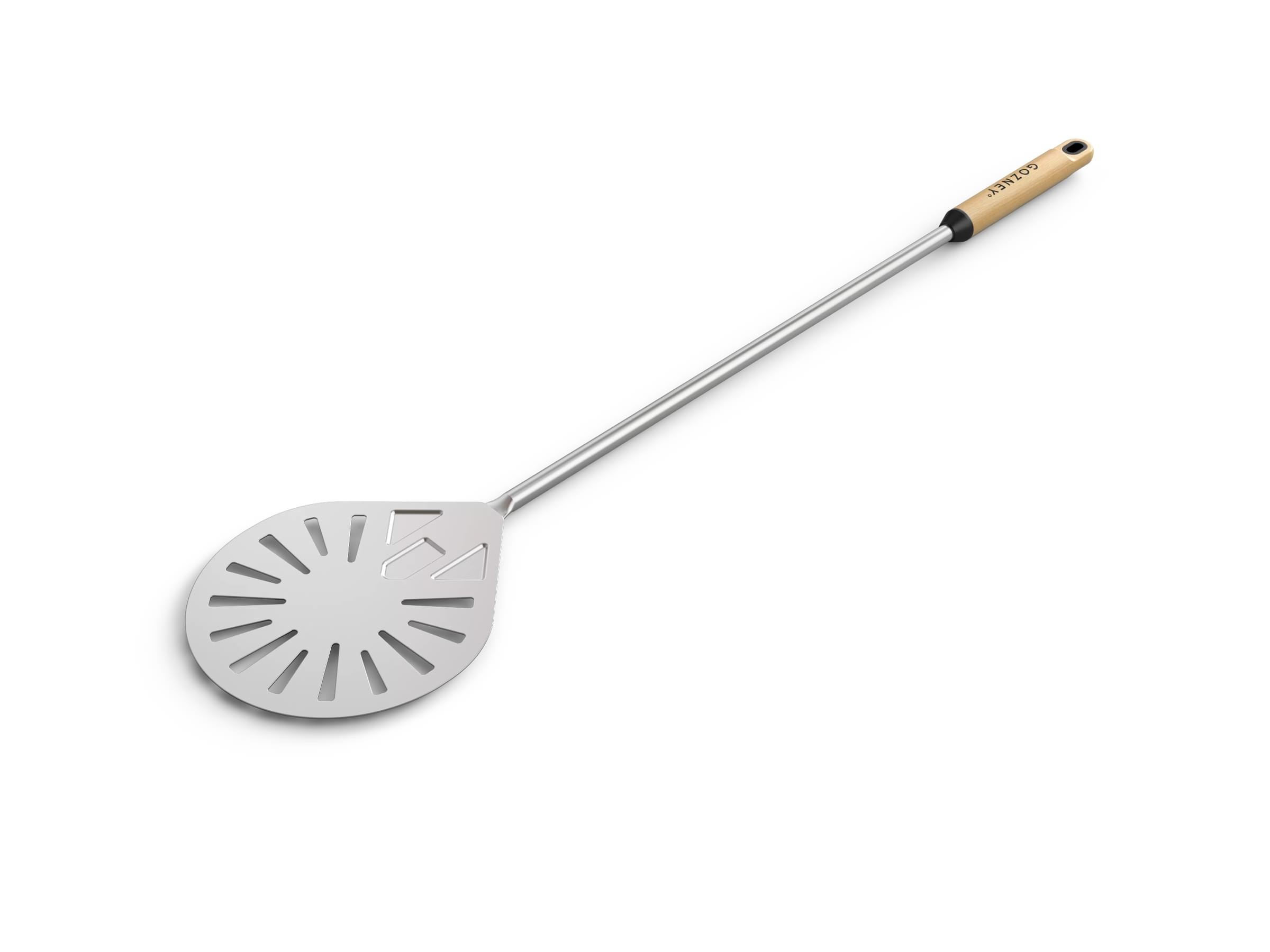 Next-level performance is effortless to handle with the Balance Turning Peel. Combining a larger aluminum blade with a comfortable Beech wood handle, this durable turning peel enables you to turn and move pizza with greater ease and control. The tear drop shape is designed to enhance the turning motion, with the entire blade being pressed and welded for a snag-free experience. The perforated metal lets excess flour fall through for delicious crust without the unwanted burnt taste. Designed to be ergonomic, the wood handle shifts the center of gravity closer to the hand for more control when moving pizza. The soft touch of the wooden handle is timeless and classic in its feel. Create pizza with confidence with the perfect balance of performance and ease