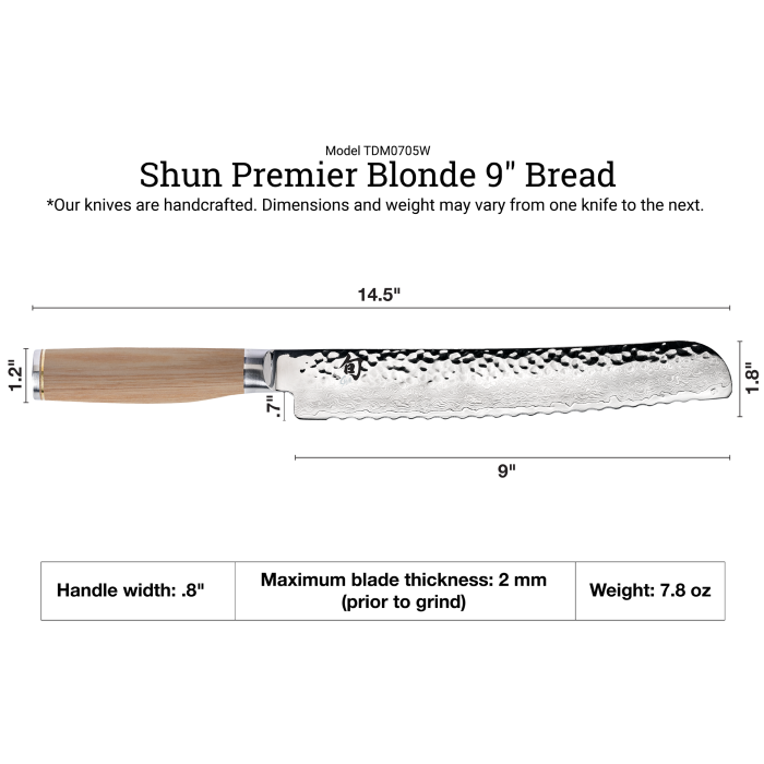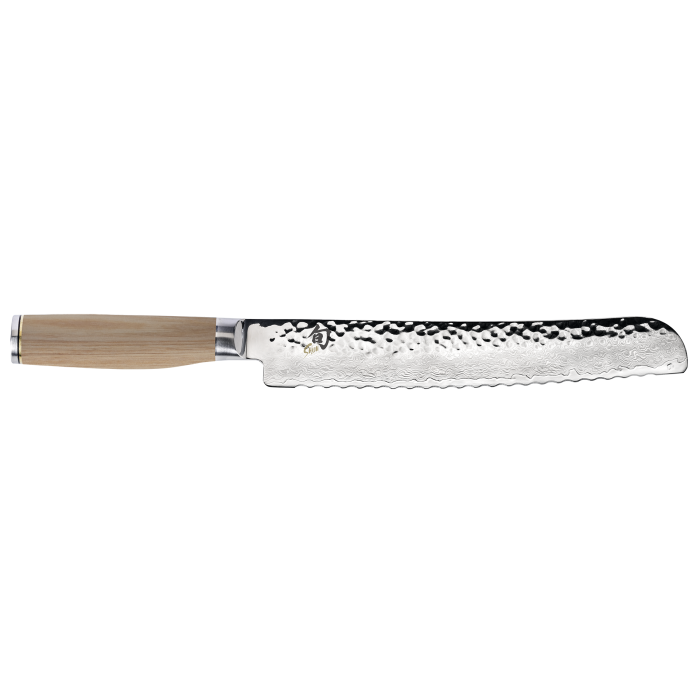 If you bake or buy whole loaves of bread, a bread knife will be one of the most-used knives in your kitchen. Whether you love wonderfully crusty or delicately tender bread, the Shun Premier Blonde Bread Knife will be your loaf's new best friend, no matter what its texture. The key is Shun's razor-sharp, wide, “low frequency" serrations. Unlike a plain-edged knife, the serrations let you gently saw through the bread without crushing and with much less crumbing. Unlike sawtooth serrations that are spaced closer together, the Shun Premier Blonde Bread Knife's wide serrations will gently glide through the bread without tearing. This keeps the bread's texture intact and enhances eating pleasure. Cakes and pastries also benefit from the Shun Premier Blonde Bread Knife's smooth cutting capabilities.