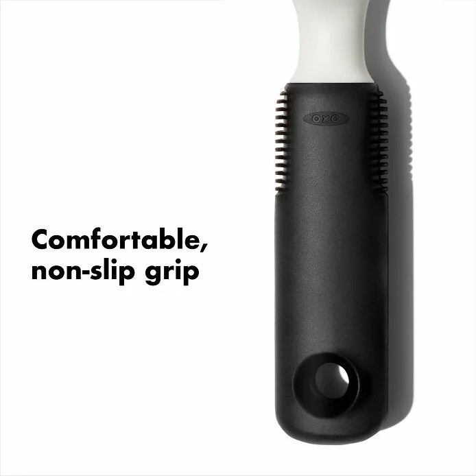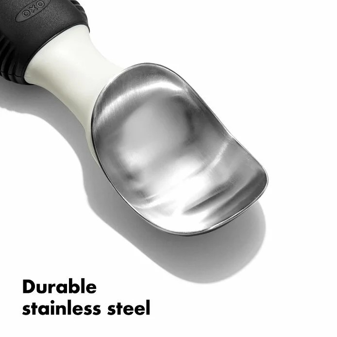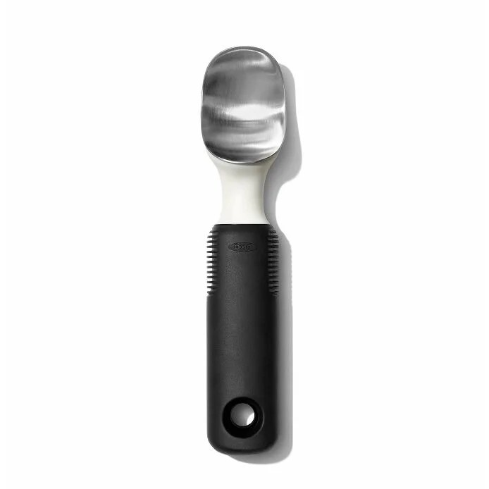 Dish up cone after cone with ease. The pointed shape and comfortable weight of the OXO Good Grips Simple Ice Cream Scoop mean you can glide right through sorbet, frozen yogurt and ice cream. The flat edges let you scrape every last bit from the corners of your container. The non-slip grip is comfortable even with repeated use, and the stainless steel head won’t chip, pit or discolor. Dishwasher safe.