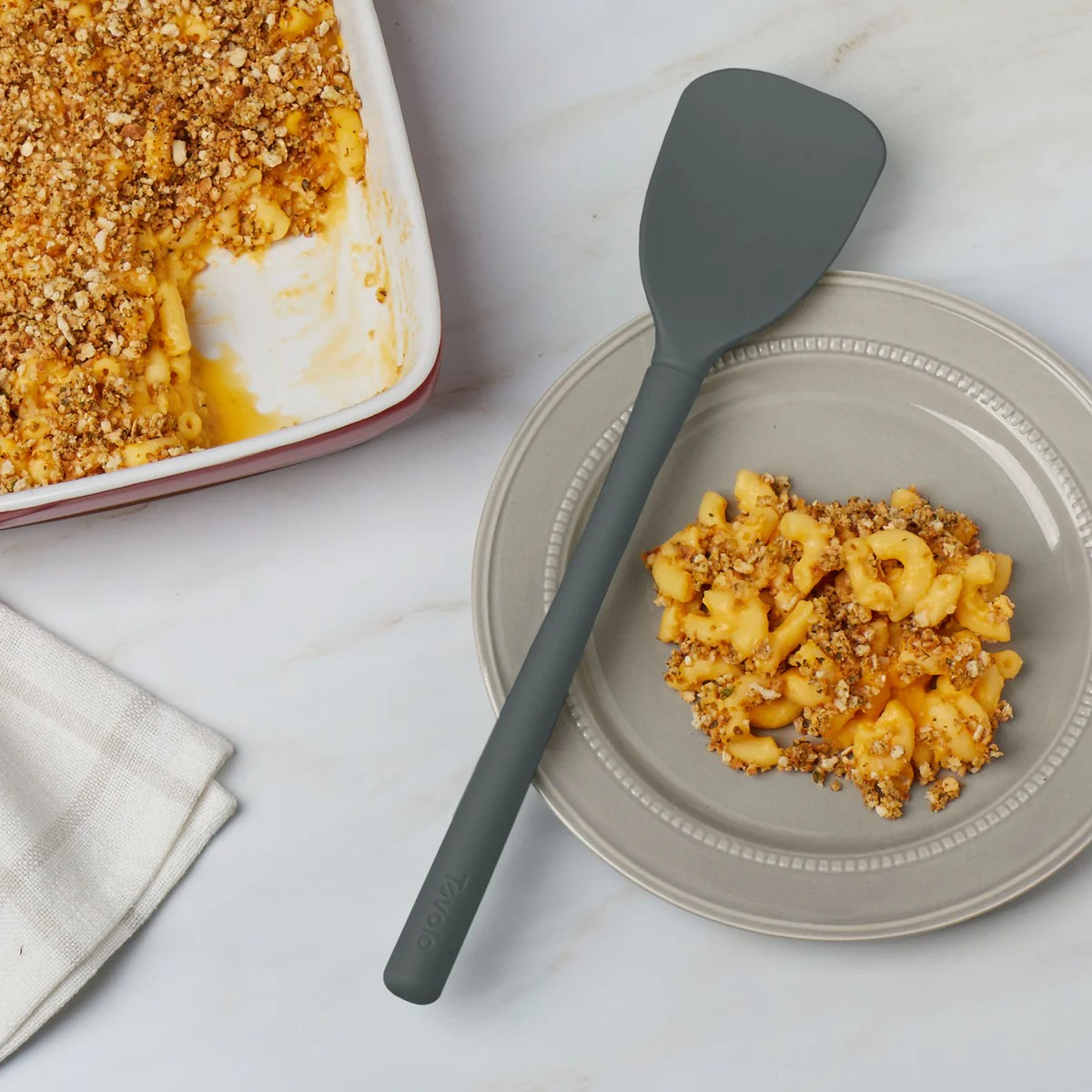 Meet your kitchen's new multi-tasker. This hybrid scoopula combines a deep spoon bowl with a flat scraping edge, eliminating the need to swap tools mid-task. The silicone head is reinforced with a nylon core, giving you the strength to handle thick batters and doughs while maintaining flexible edges that conform to bowl curves for complete scraping. The thoughtfully designed ergonomic handle reduces hand fatigue during scooping, stirring, and serving. Heat resistant to 600°F and dishwasher safe, it's built to handle whatever your kitchen demands—from baking projects to everyday meal prep.