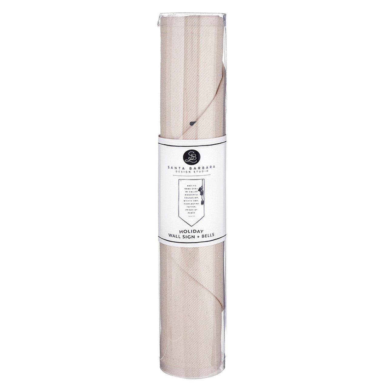 Celebrate the season with this exquisitely crafted canvas banner featuring Isaiah 9:6. Made from high-quality neutral canvas, the elegant lettering is printed directly onto the fabric for a refined look. Accented with delicate gold metal bells, the piece adds a subtle, sophisticated charm to your decor. Measuring 28" by 14", it includes string and hardware for easy hanging, bringing a serene and joyful presence to your home.