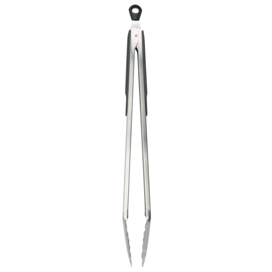 Tongs are a true kitchen workhorse, so you need a sturdy pair. The OXO Good Grips 16-inch Tongs are built to last with high-heat resistant stainless steel. Our Tongs feature scalloped edges for a secure grip whether you're turning a big, thick steak or flipping a shrimp. Soft, non-slip handles absorb pressure so you can grip, toss, turn and flip without strain. The Tongs lock closed for compact storage when hanging or in a drawer. Dishwasher safe