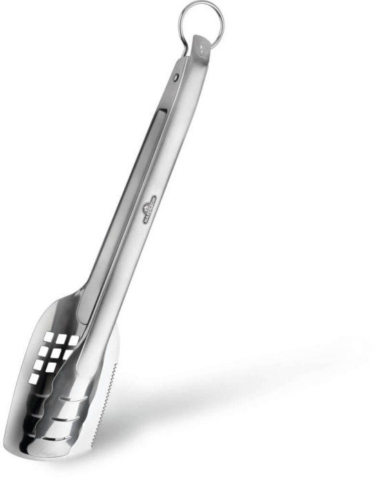 Two of the most used barbecue grill tools in one; a sturdy spatula and tongs in a single barbecue accessoryEasy to use slide lock mechanism that doubles as a convenient tool hanger loopDurable stainless steel construction for long lifeEasy to clean, these tongs are dishwasher safeThe Spatula end features a beveled edge making it easy to get under cooking food and a cutting edge to provide perfect portions or cut food on the flySupport and stabilize food when flipping and turning