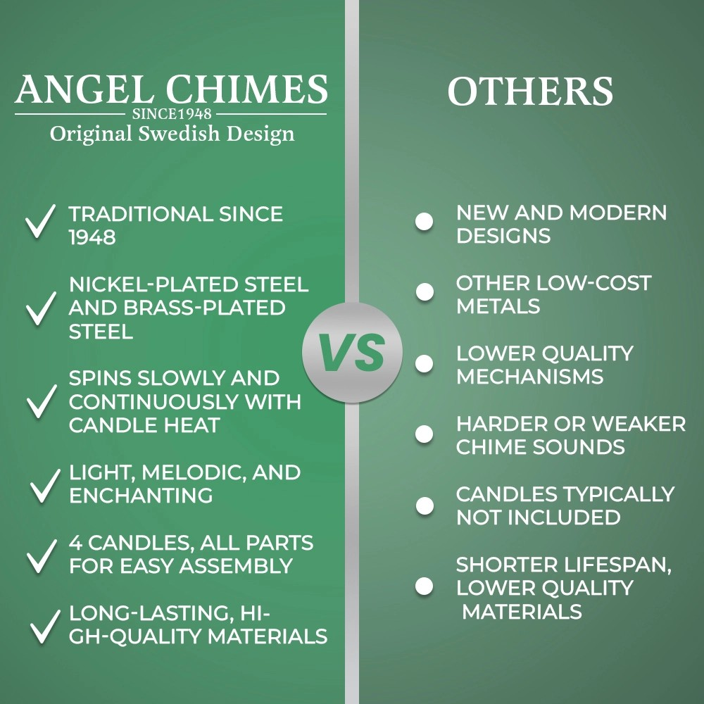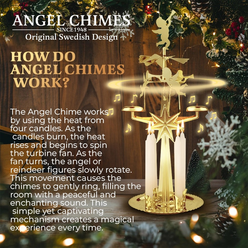 Made from premium polished brass, the Original Swedish Design Angel Chimes is built to last for generations. Its precisely balanced structure ensures the angels spin smoothly as candle heat rises, producing the gentle chime sound that has enchanted families since 1948. Each set includes the brass frame, decorative angel figures, chime bells, holders for 4 standard chime candles, and easy assembly instructions. The polished finish gives a warm golden glow, while the durable construction prevents bending or warping over time.
