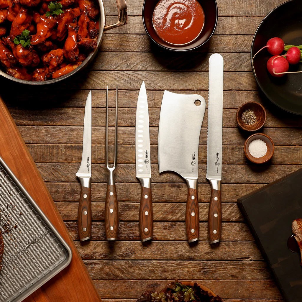Our high quality Avanta Pakkawood blades are crafted from German X50 stainless steel for knives that are sharp, rust resistant, and easy to maintain. Solid bolsters and full tang construction give the knives great balance and heft. Avanta knives are made with beautiful full tang, triple rivet, rose pakkawood handles.