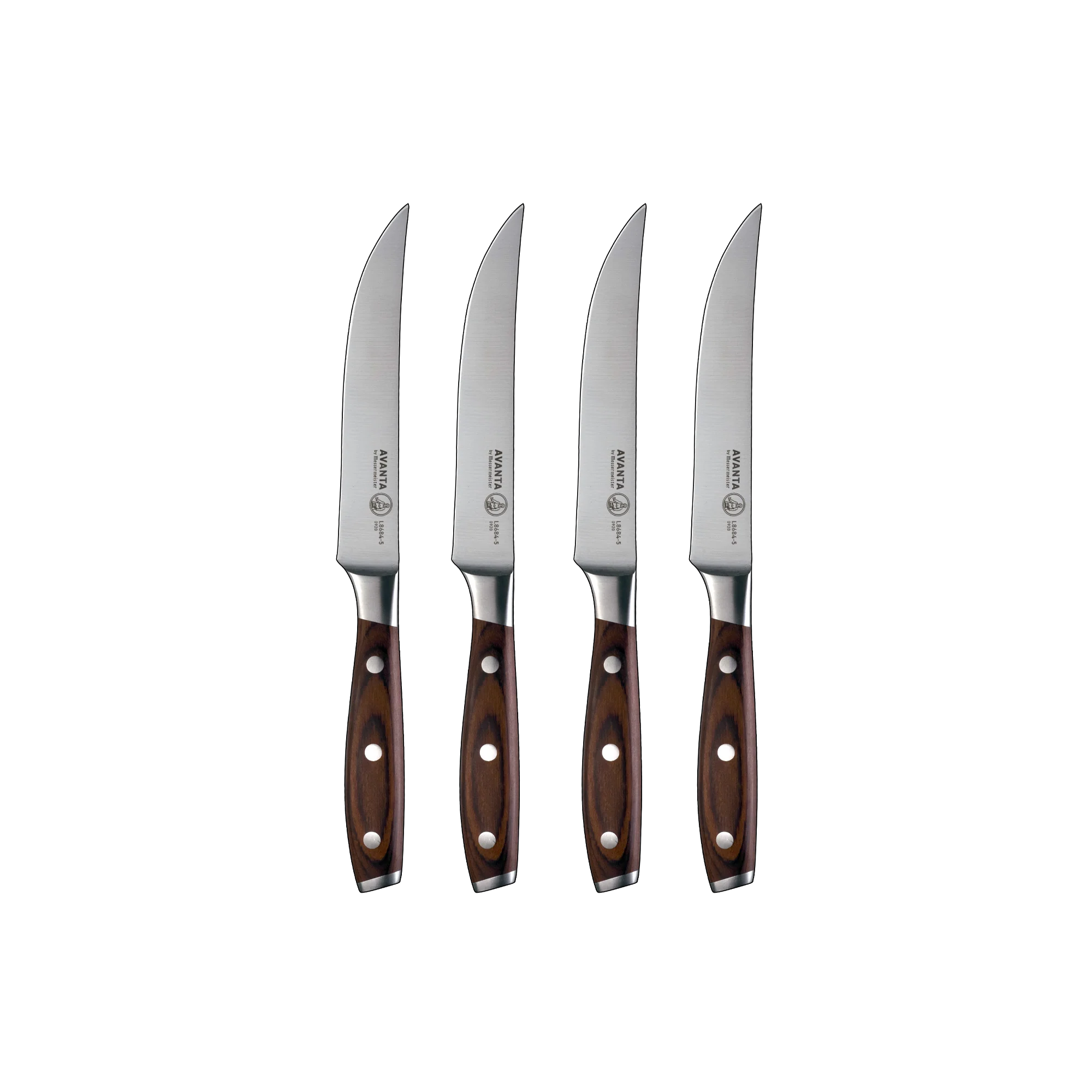 Originally developed for one of North America's leading culinary schools, Messermeister's Avanta knives showcase exceptional craftsmanship in the Avanta Pakkawood 4-Piece Fine Edge Steak Knife Set, designed to elevate your dining experience. Each fine-edged blade is crafted from premium German X50 stainless steel, providing superior sharpness, rust resistance, and durability. With full tang construction and triple-riveted rose pakkawood handles, these steak knives offer perfect balance and control, ensuring smooth, precise cuts through any steak or cut of meat.