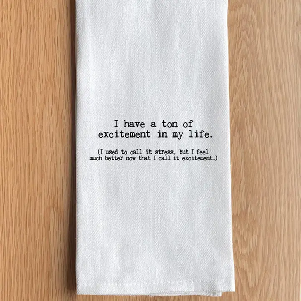 Add a splash of fun to your kitchen with the “I Have A Ton Of Excitement” tea towel! Sized perfectly for everyday use, this 100% cotton towel is hand-printed one at a time, softening beautifully with each wash. Its durable fabric and vibrant print make it an essential, absorbent helper for all your kitchen adventures. Wrap it around fresh banana bread for a charming hostess gift that celebrates handmade beauty. Machine wash cold, warm dry to keep it looking and feeling great!