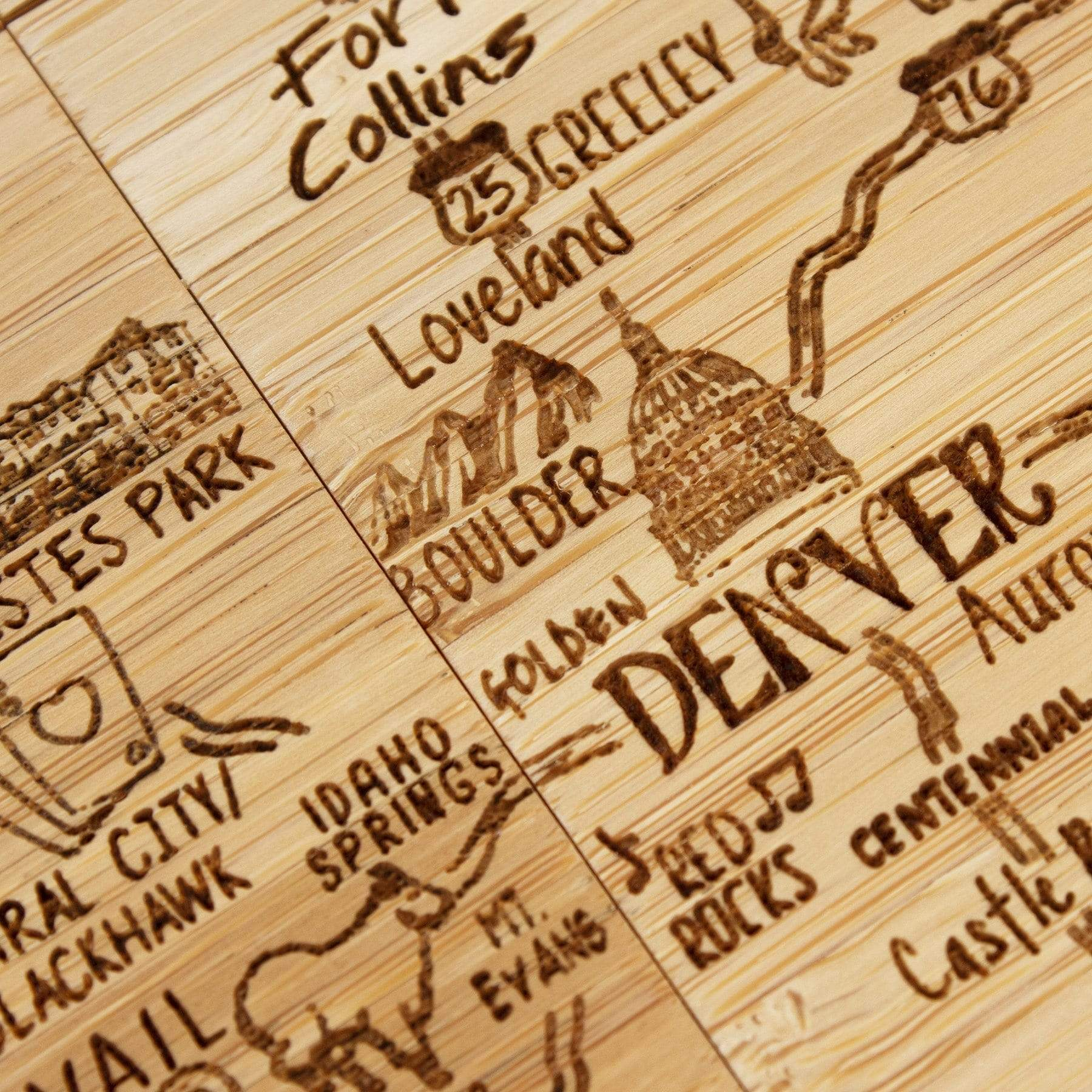 Celebrate The Centennial State while keeping tables safe from water marks with the Totally Bamboo Colorado State Puzzle 4 Piece Bamboo Coaster Set with Case. These sturdy bamboo coasters feature laser engraved artwork of Colorado that highlights all the memorable sights and places that make the state great: from Denver to Aspen, Fort Collins to Colorado Springs, Pikes Peak to The Great Sand Dunes and everywhere in between! The "map" is spread out across the four coasters so when they are placed together it completes the picture. This "puzzle" theme makes for a great conversation piece at parties and get-togethers. The set includes a sturdy and handsome case to hold the coasters when they're not in use. This coaster set makes a fantastic gift for anyone who loves Colorado; it ships with a colorful state-themed tag and wrapped neatly in raffia. Each coaster measures 4 inches by 4 inches to accommodate all popular glass sizes